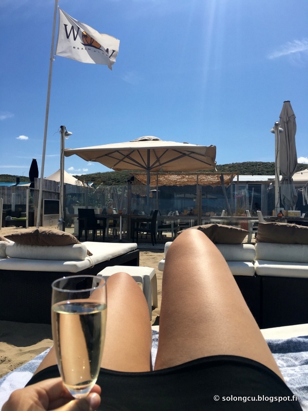 Kyllä. Päiväkännit Scheveningen rantaklubeilla. No ei vaan. Sää oli kyllä kaunis ja päivä alkoi aivan liian vahvoilla kookoksen makuisilla drinkeillä, joista omani tarjoilija koristeli synttäreiden kunniaksi tuollaisella "tähtisadetikulla" (vähän eri luokkaa mitä yleensä tottunut, mutta niin on hollantilaisten ilotulituksetkin, joten eipä siinä), joten kyllä sitä ihan mielellään maanantaiaamuna synttäreiden kunniaksi vähän kuplivaa otti. Ja aurinkoa. Huomaa, ettei iho ole enää entisensä, kun onnistuin tuolla muutaman tunnin makoilulla saamaan sen iltaa kohden kohtuu punakaksi - onneksi pieni puna oli seuraavan päivän bruna, mutta silti.